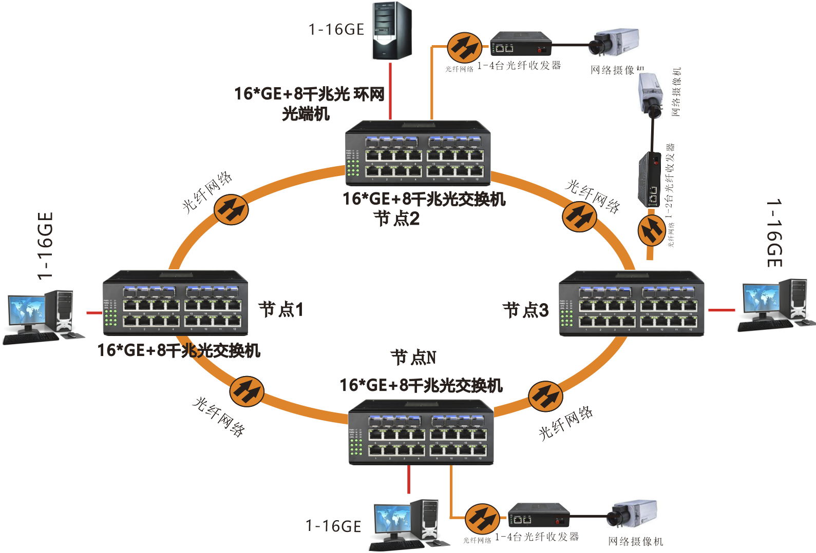 當某處光纖故障時,系統(tǒng)會在20ms內(nèi)重建網(wǎng)絡(luò)鏈路,保障系統(tǒng)的正常通信,實現(xiàn)對總線信號傳輸?shù)淖杂Wo功能,網(wǎng)絡(luò)故障排除后系統(tǒng)會自動恢復(fù);不支持相切環(huán)。