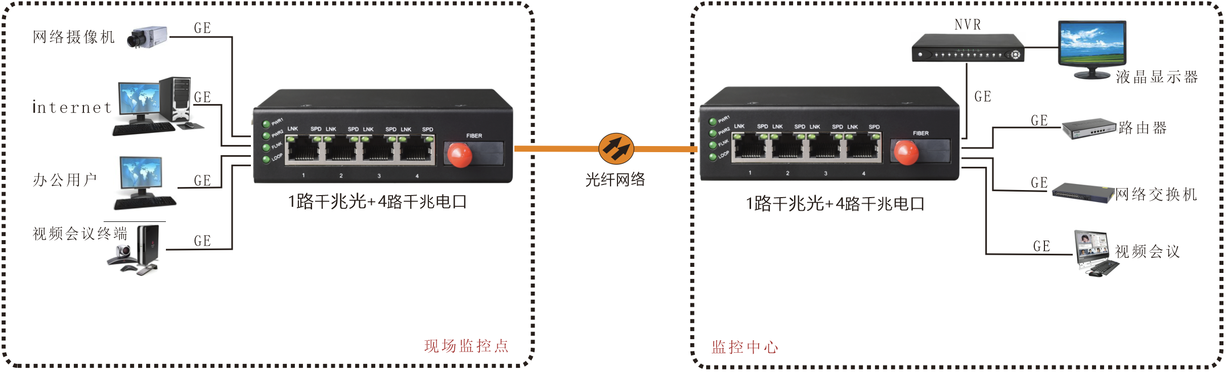 l 設備提供4路千兆以太網(wǎng)電口, 1路千兆光口,傳輸帶寬為線速1000M,千兆光口支持20/40/60/80/120KM距離傳輸;
