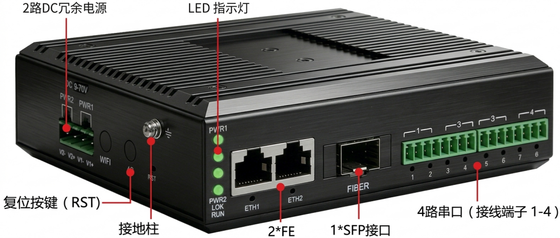 • 4*RS232/422/485軟件可配 • 300bps~921600bps • 2*FE可級連設(shè)備 • 1*SFP光口遠傳網(wǎng)絡(luò) |