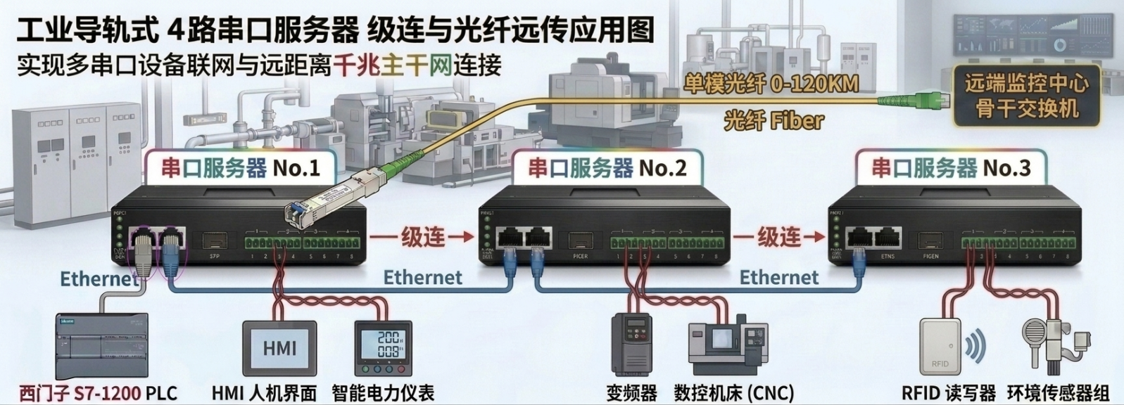 應(yīng)用場景一:2電1光串口服務(wù)器: 3臺設(shè)備電口級連,光口遠傳