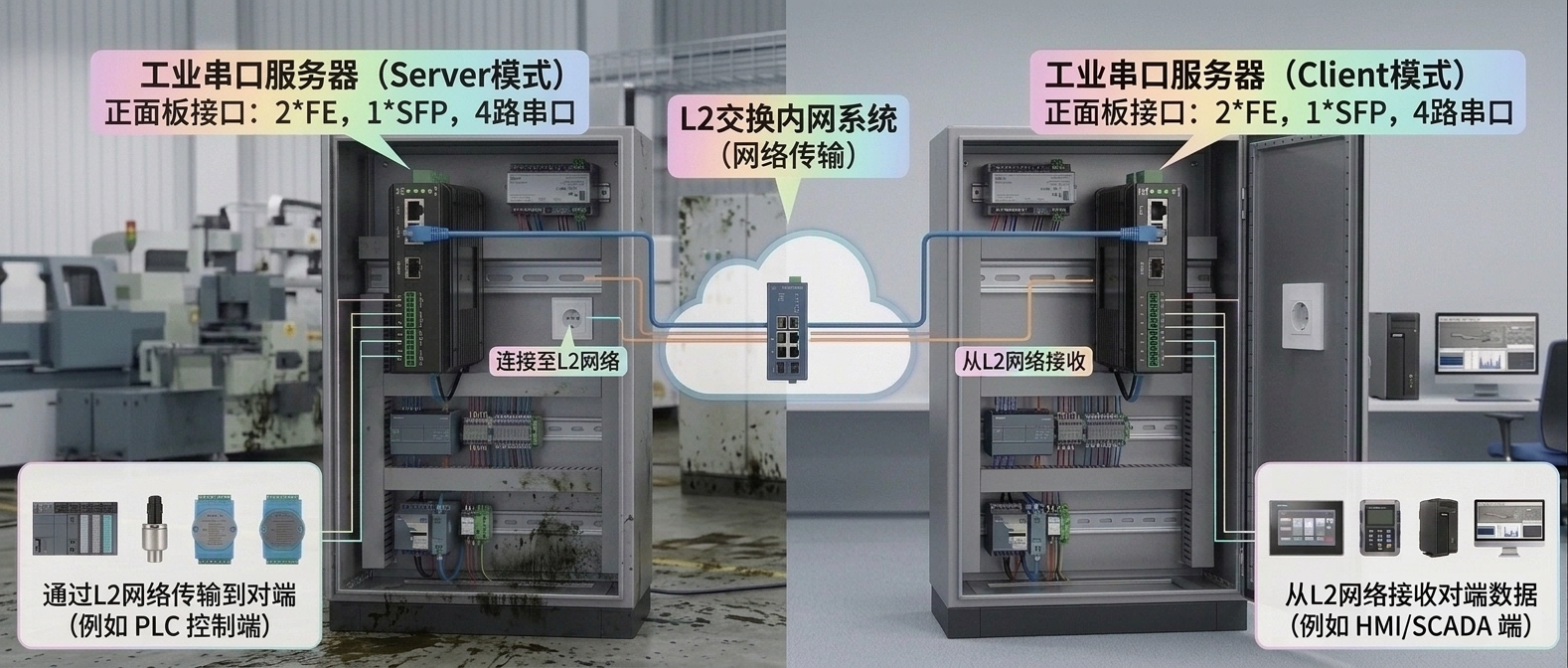 應(yīng)用場景二:兩臺成對應(yīng)用,中間通過網(wǎng)絡(luò)交換層傳輸1-4路串口
