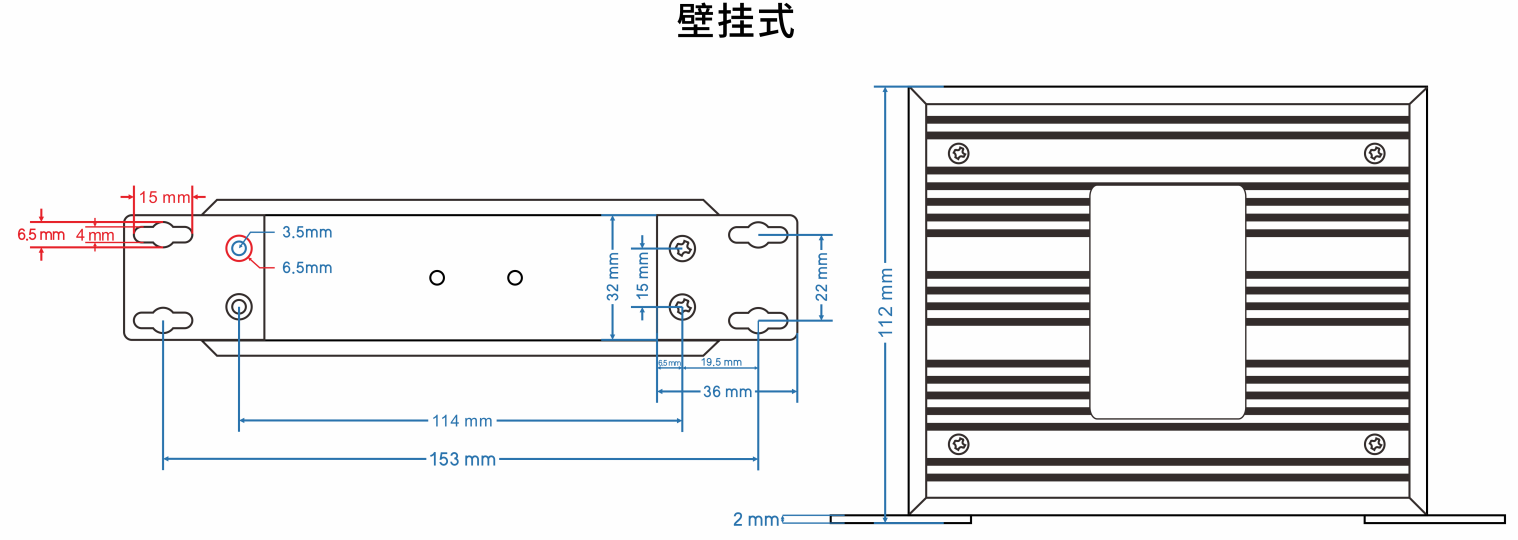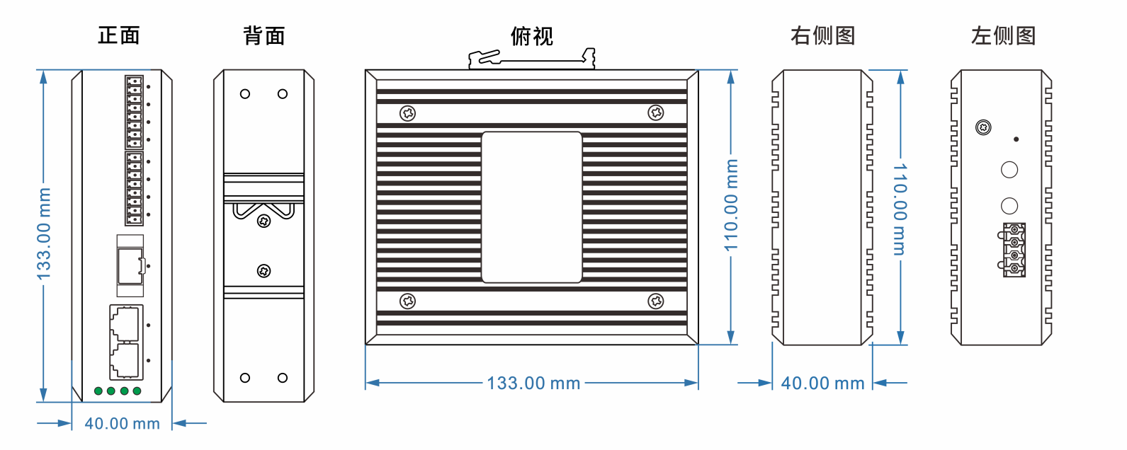 尺寸:133 × 120 × 40 mm 重量:0.65 kg 外殼:鋁合金陽極氧化,IP40 安裝:35mm DIN 導(dǎo)軌 / 壁掛 |