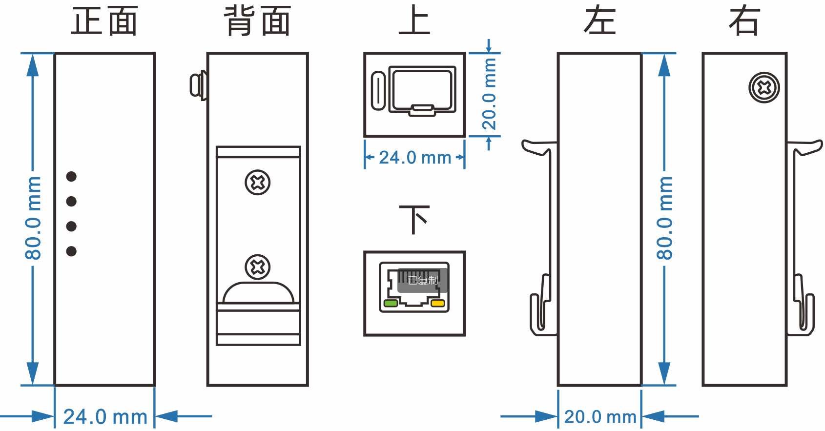 尺寸:24mm(長(zhǎng)) x 80mm(寬) x 20mm(高) 安裝方式:35mm導(dǎo)軌安裝、壁掛式安裝 |
