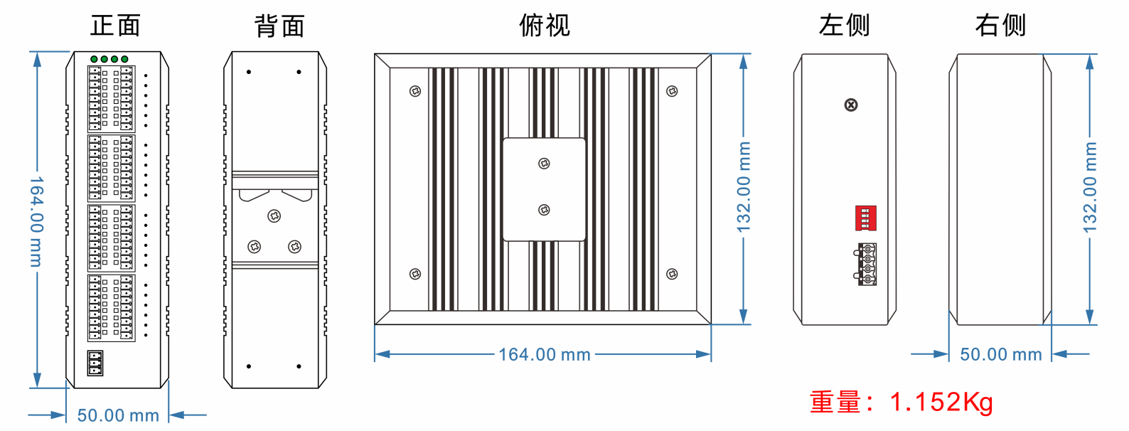 外殼:IP40防護等級,鋁合金材質(zhì) 尺寸:164mm(長) x 132mm(寬) x 50mm(高) 安裝方式:導(dǎo)軌安裝、壁掛式安裝 |