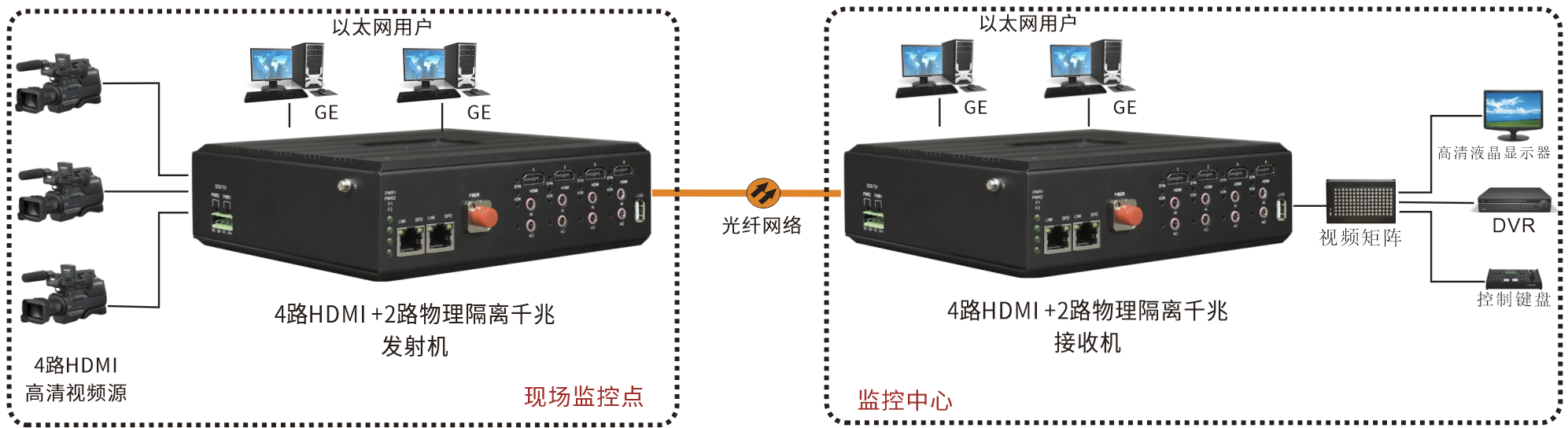 | 產(chǎn)品功能描述 | 在光纖上同時(shí)傳送4路2K HDMI 信號(hào) + 2路物理隔離千兆以太網(wǎng)+1路USB |